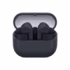 אוזנייה שמאלית של Galaxy Buds3 FE בצבע שחור פונה שמאלה בחזית, והאוזנייה הימנית נמצאת מעט מאחור ופונה ימינה.